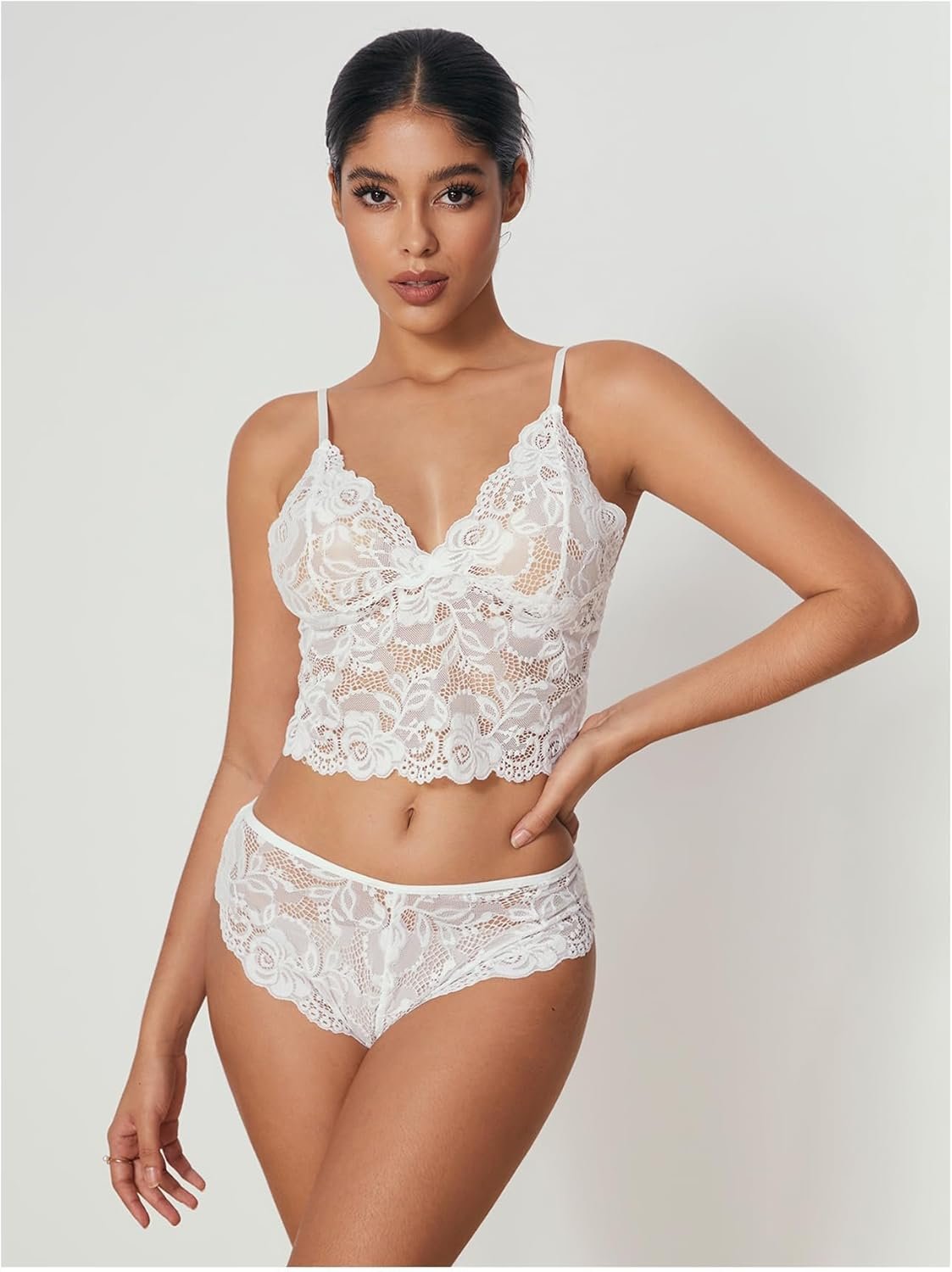 WDIRARA Women’ Silk Satin Pajamas Set 4pcs Lingerie Floral Lace Cami Sleepwear with Robe