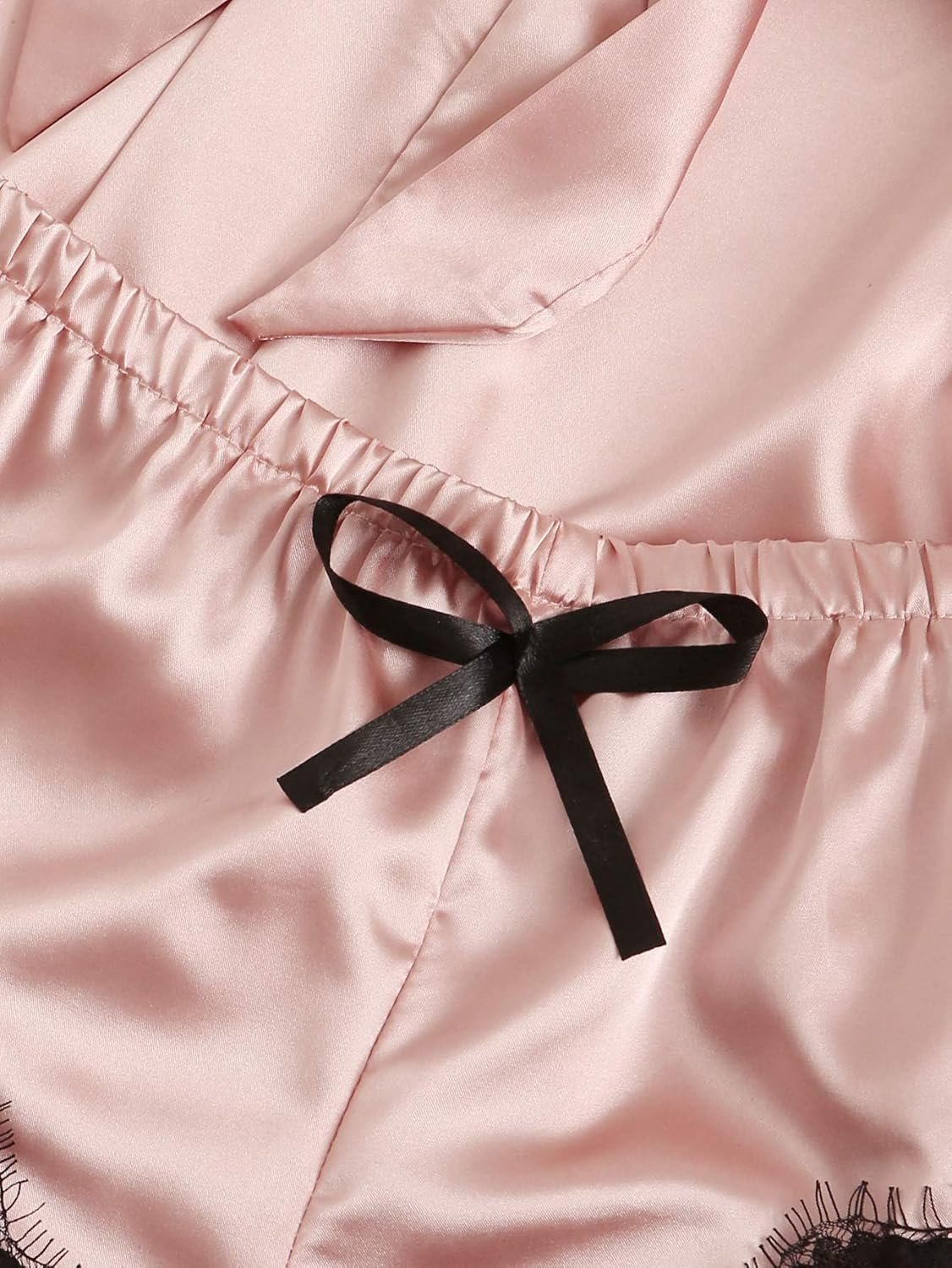 WDIRARA Women’ Silk Satin Pajamas Set 4pcs Lingerie Floral Lace Cami Sleepwear with Robe
