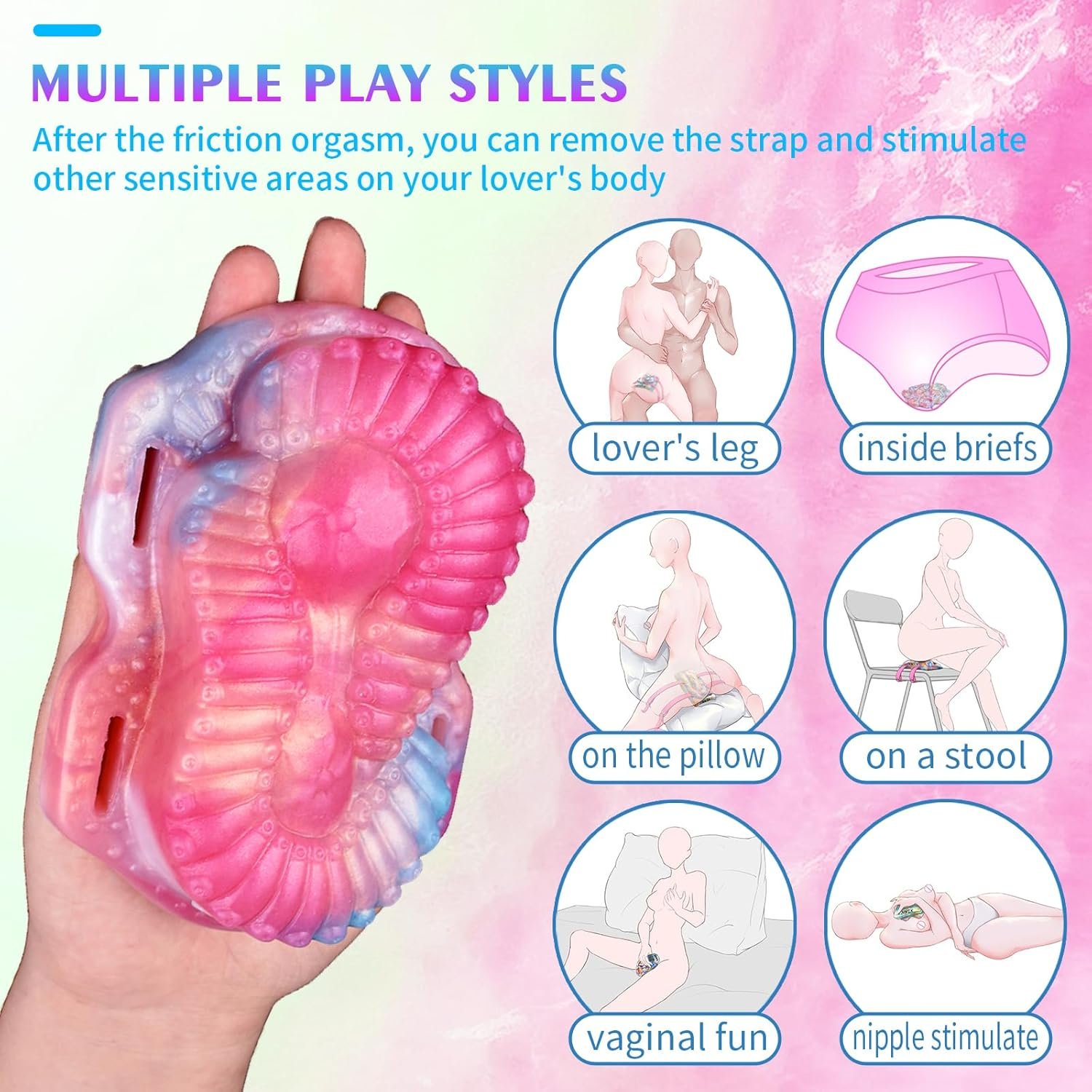 [Multi-functional Unisex Grinding Pad Vibrator]-It has two ways of playing—worn on the body or held in hands. In the first case, you’re allowed to enjoy the stimulation to clitoris and anus whilst kissing your partner during foreplay. You can also have it fixed onto a firm pillow and enjoy yourself when loneliness creeps in. No matter whichever you choose, we strongly recommend you use it with lubricant beforehand.