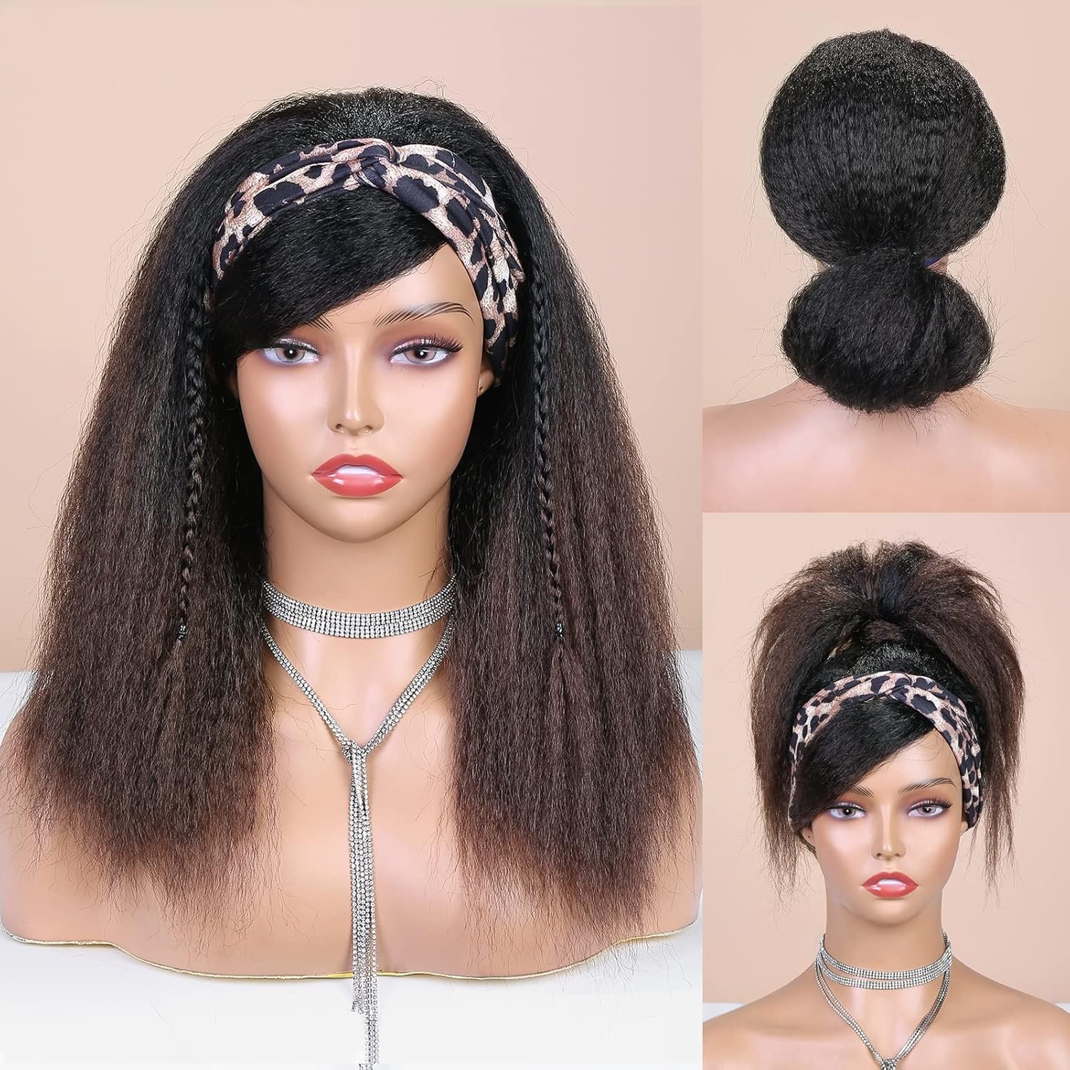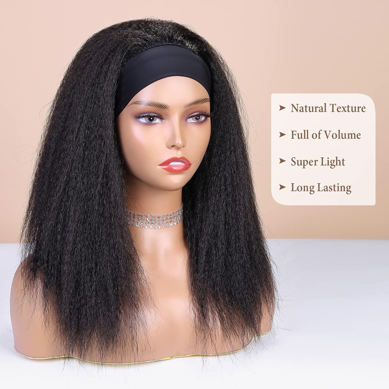 Wig Material:The Kinky Straight Headband Wigs are Made of High Temperature Synthetic Hair With Easy-to-Wear Black Headband.Super Soft and Skin Friendly. Less Tangle, Less Shedding; Silky & Soft.