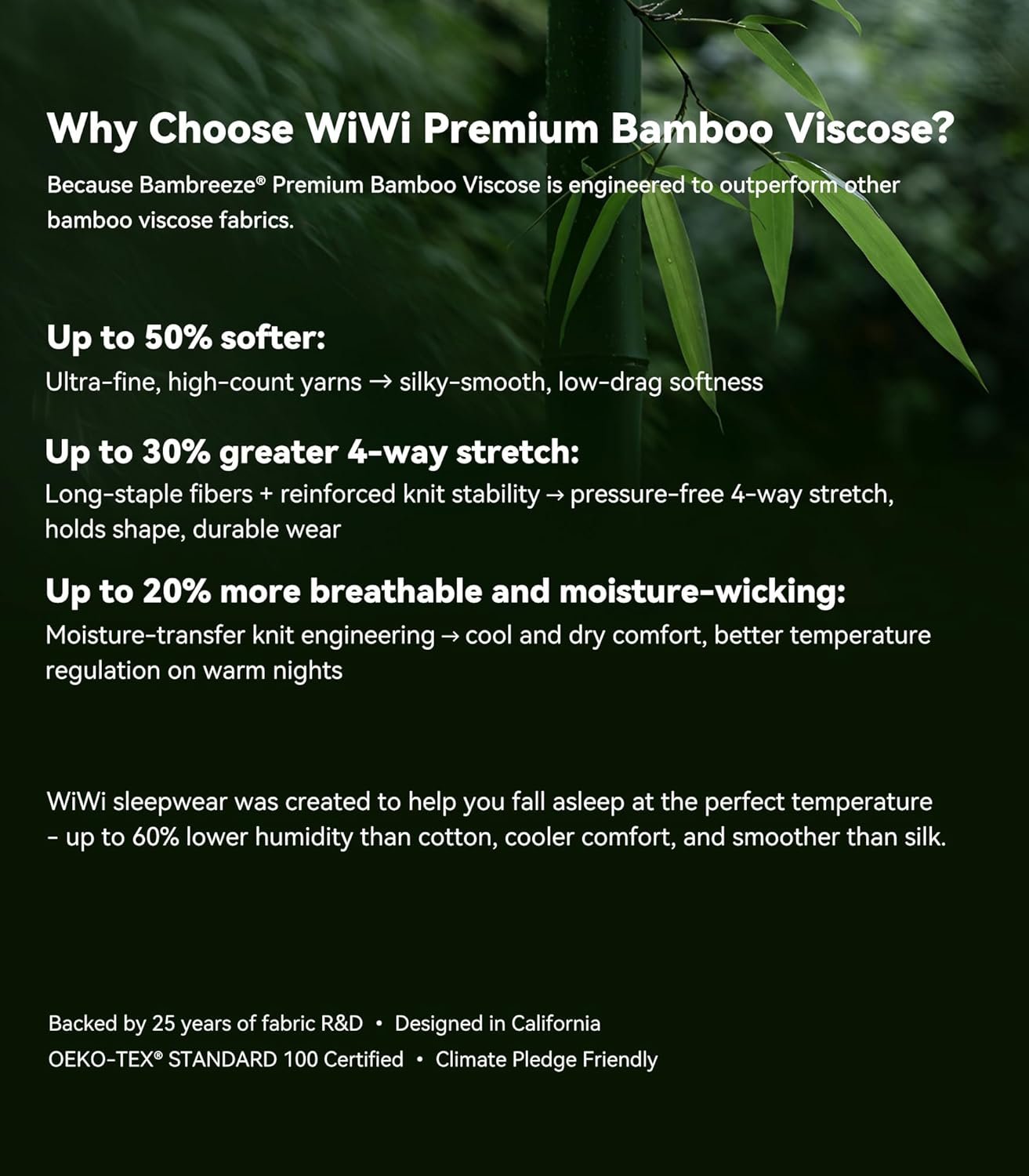 WiWi spent 25 years of fabric R&D engineering Bambreeze Premium Bamboo Viscose – so it outperforms other bamboo viscose fabrics.