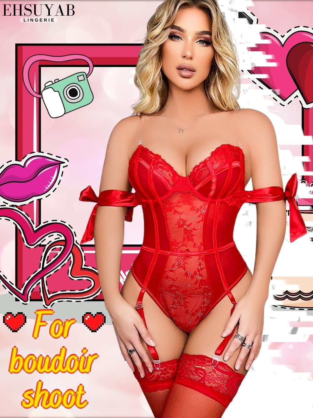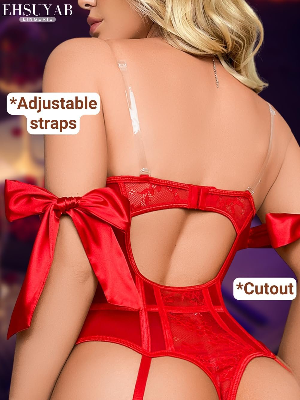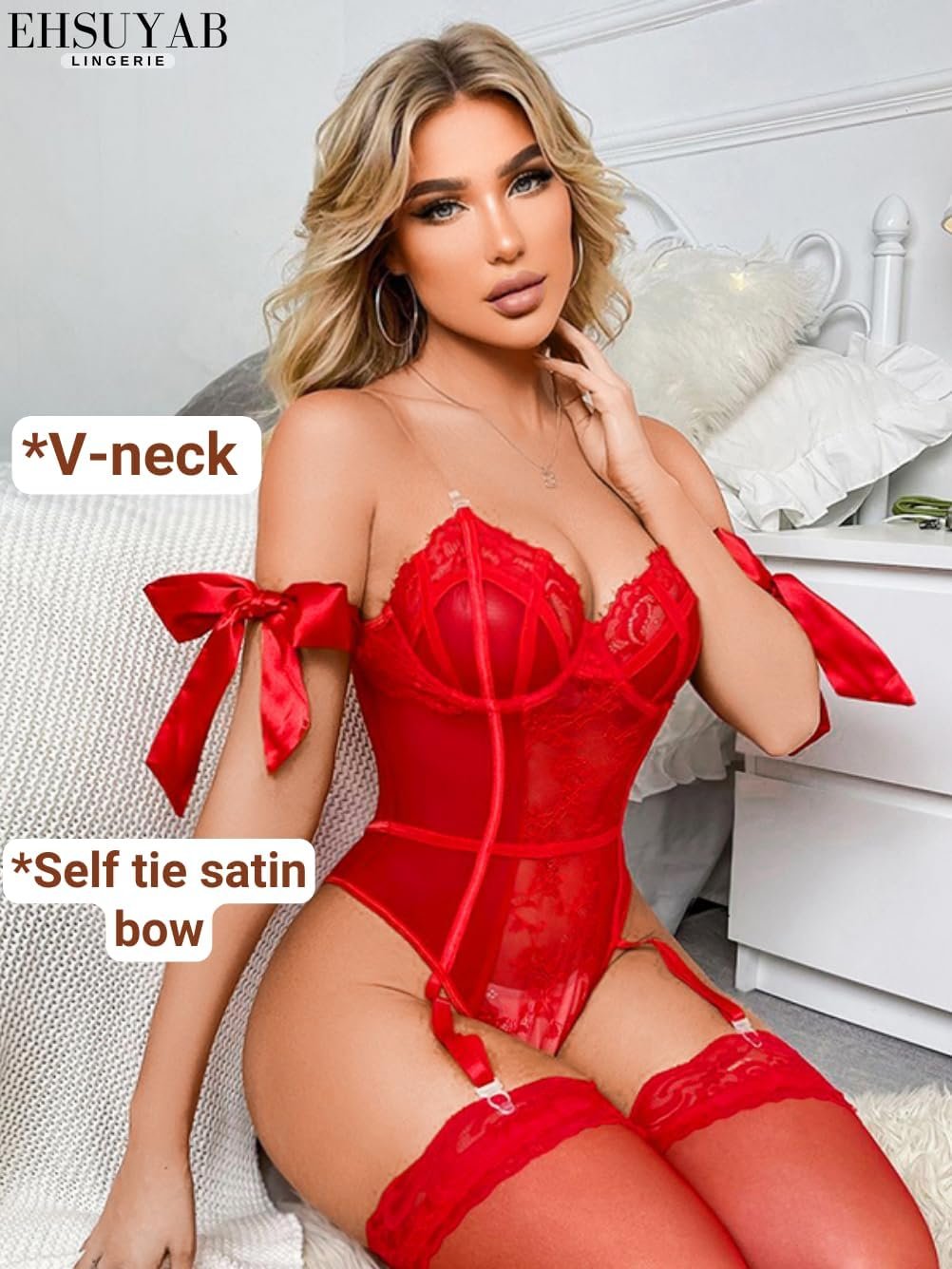 Women Christmas Bow Lingerie, Sexy Gift Underwear, Valentines Present Garter Stockings Set Date Night Exotic Boudoir