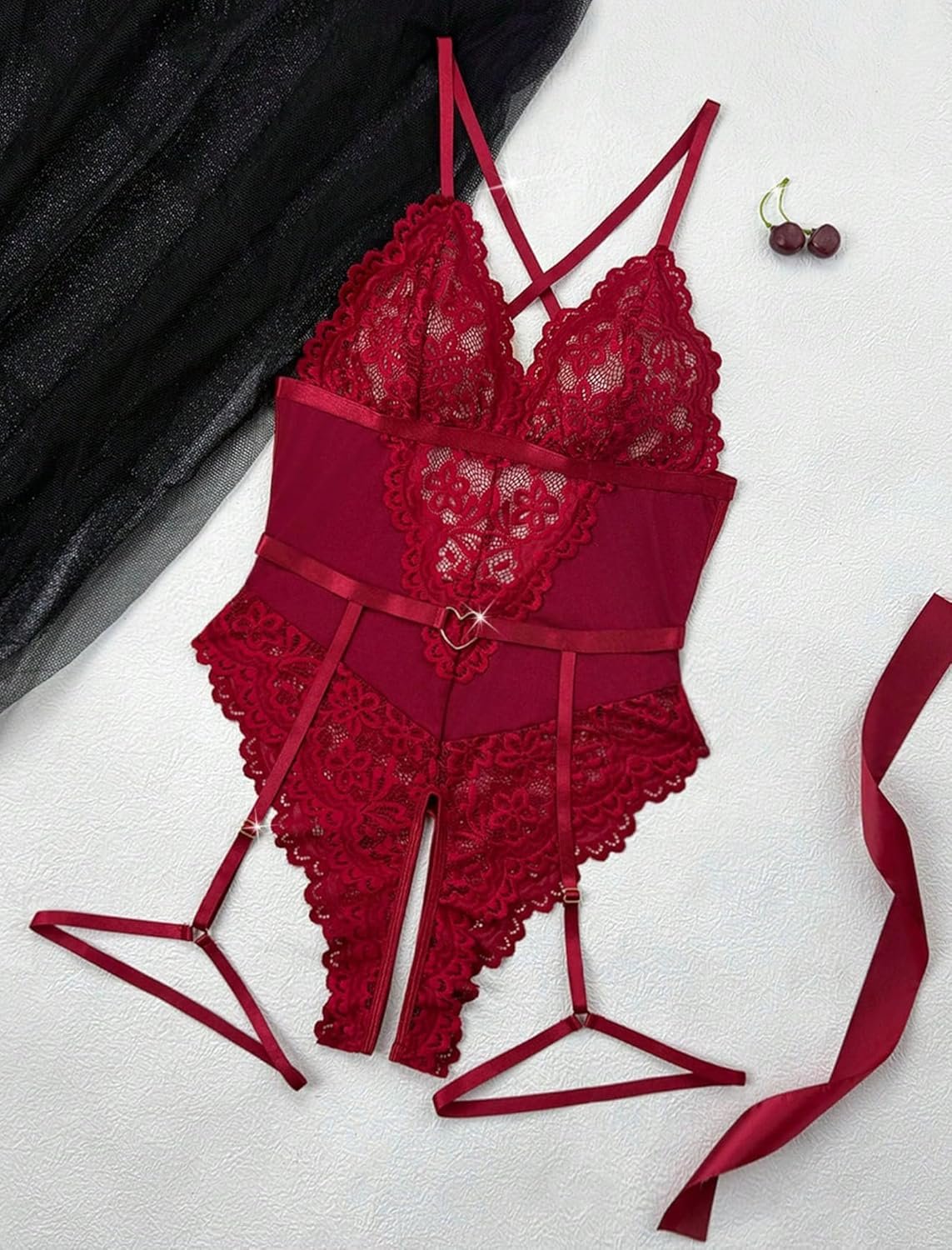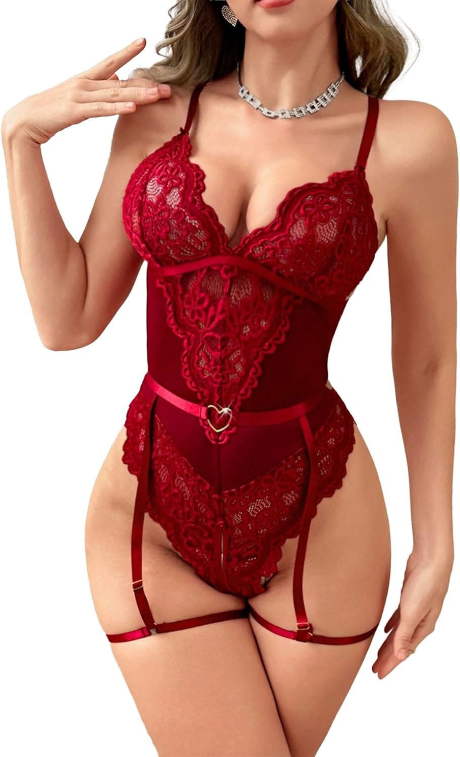 Women Lingerie Set Naughty Lace Bodysuit Sexy BabyDolls Teddy Sleepwear 2pcs (Wireless/Garter Belt/Romper Rings)