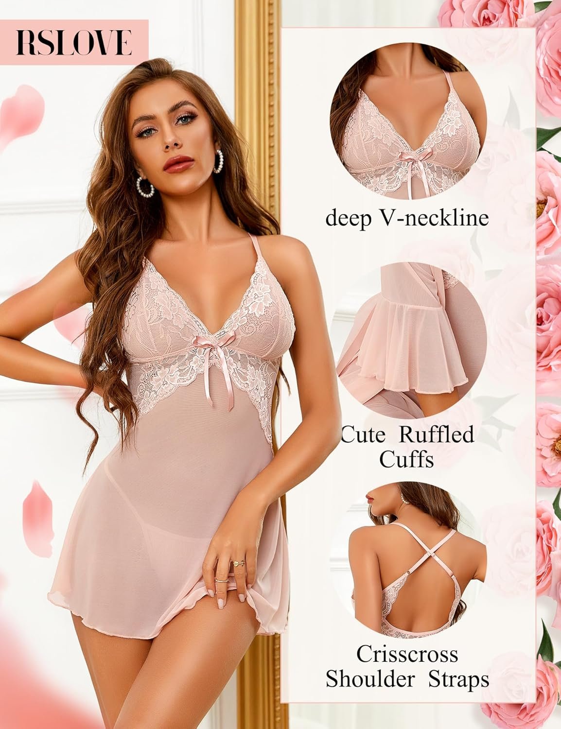 Women Sexy Lingerie Set – 3 Piece Babydoll & Lace Kimono Robe Strap Chemise Sleepwear Mesh Nightgown