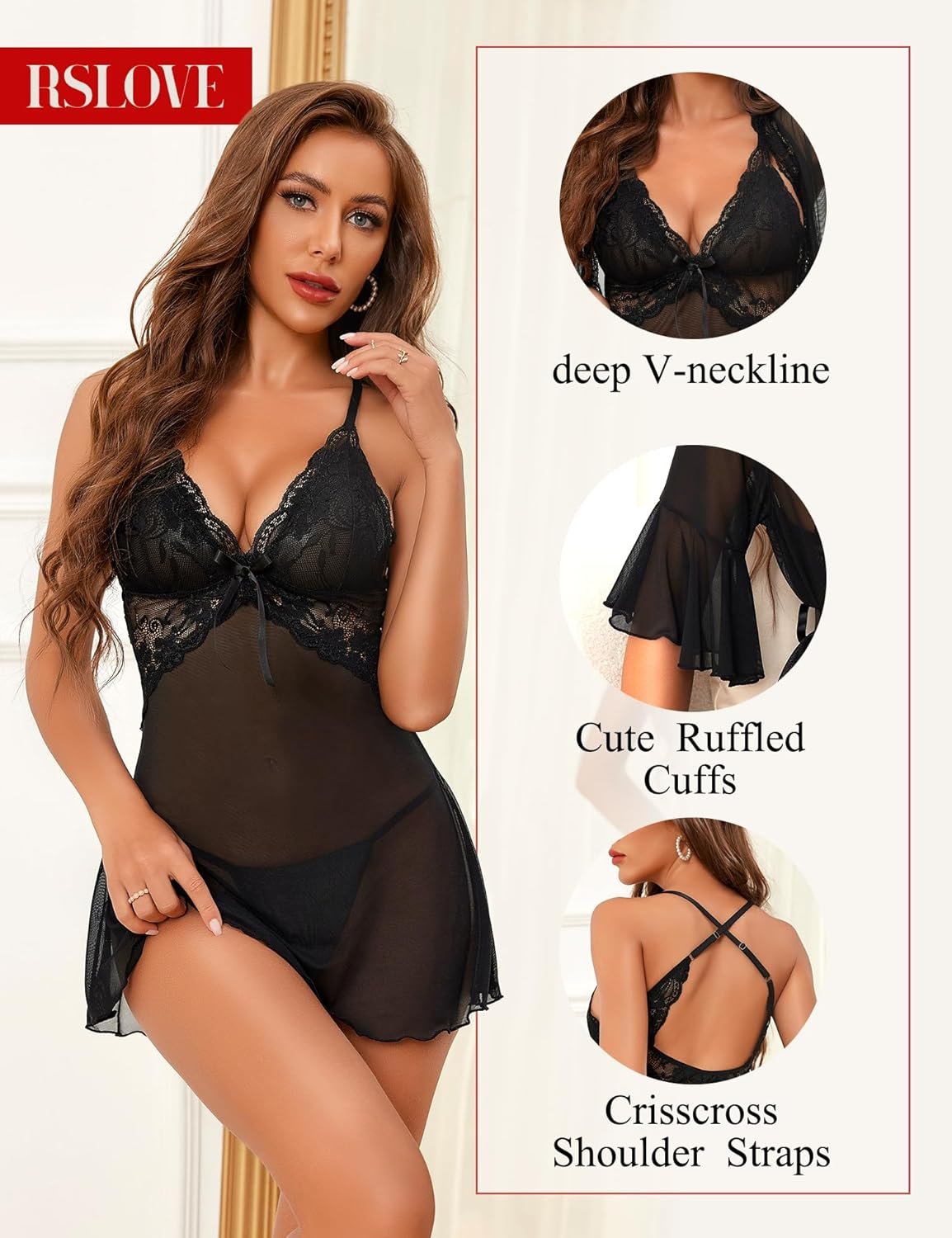 Women Sexy Lingerie Set – 3 Piece Babydoll & Lace Kimono Robe Strap Chemise Sleepwear Mesh Nightgown