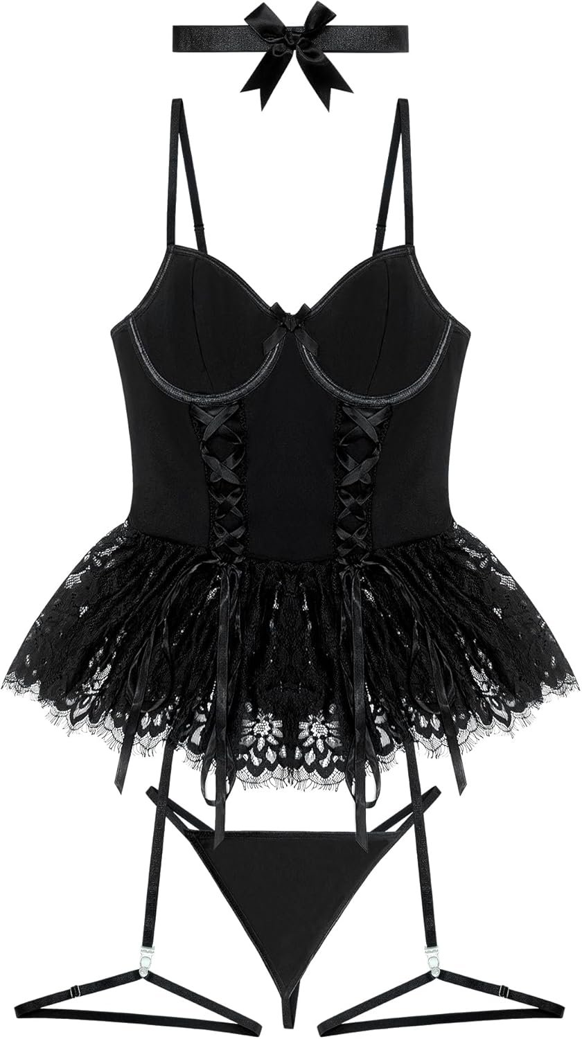 Women Sexy Lingerie Set Naughty Lace Up Corset Bodysuit Underwire Lingerie Babydoll With Garter Belt and Bow Tie