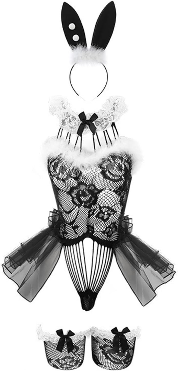 Womens Bunny Lingerie Sets Sexy Lace Teddy Bodysuit Mesh Stockings Cosplay Costume with Rabbit Ear