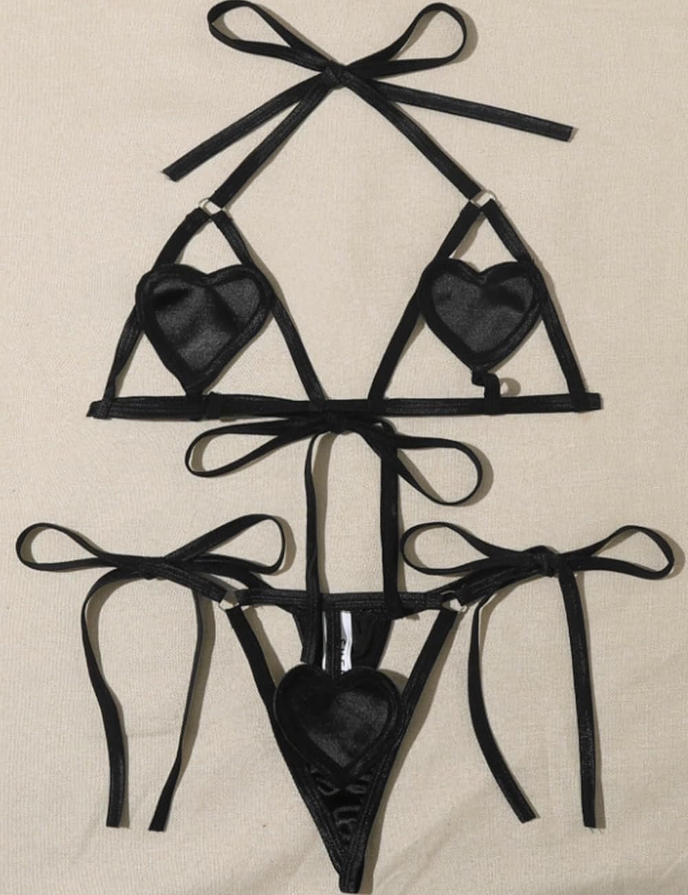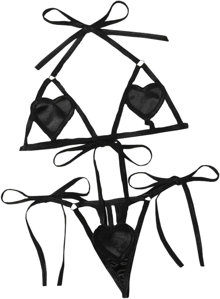 Womens Heart Mesh Sheer Lingerie Set Mini Top Tie Sides Thong Sexy Micro Swimwear Bikini Set