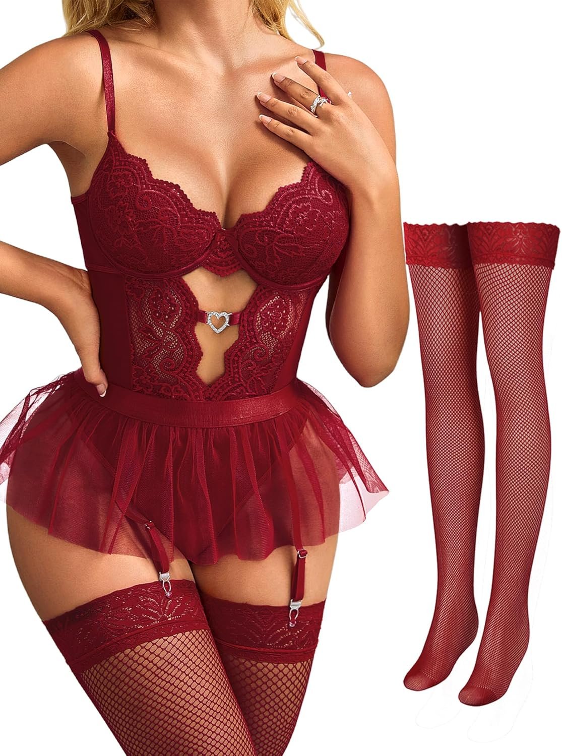Womens Lingerie Set Sexy Lace Bodysuit with Detachable Mesh Mini Skirt Push up Garter Lingerie Sets(4pcs)
