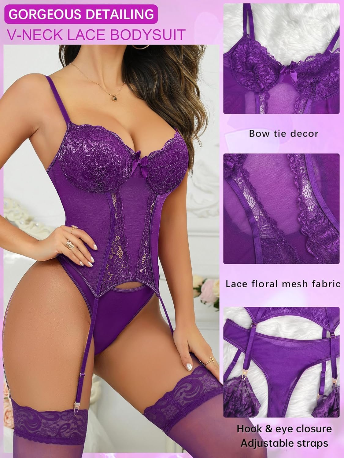 Women’s Sexy Lingerie Set with Garter Belt Lace Bodysuit Teddy Baby Dolls Panty with Stockings