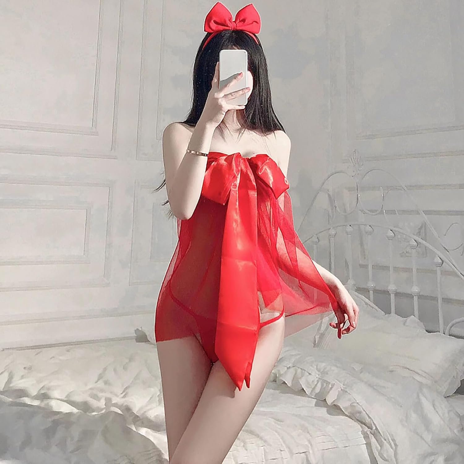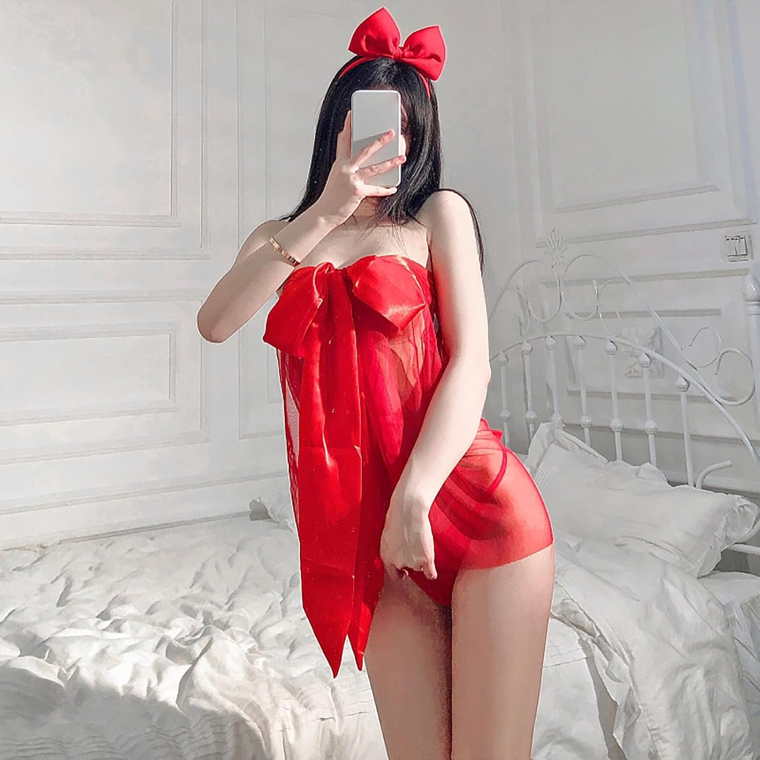 Womens Sexy Sleepwear Set Mesh See Through Solid Color Bow Tie Nightdress Pant Cosplay Naughty Exotic Lingerie Sets